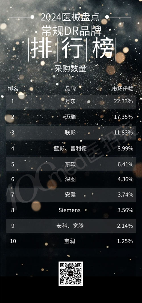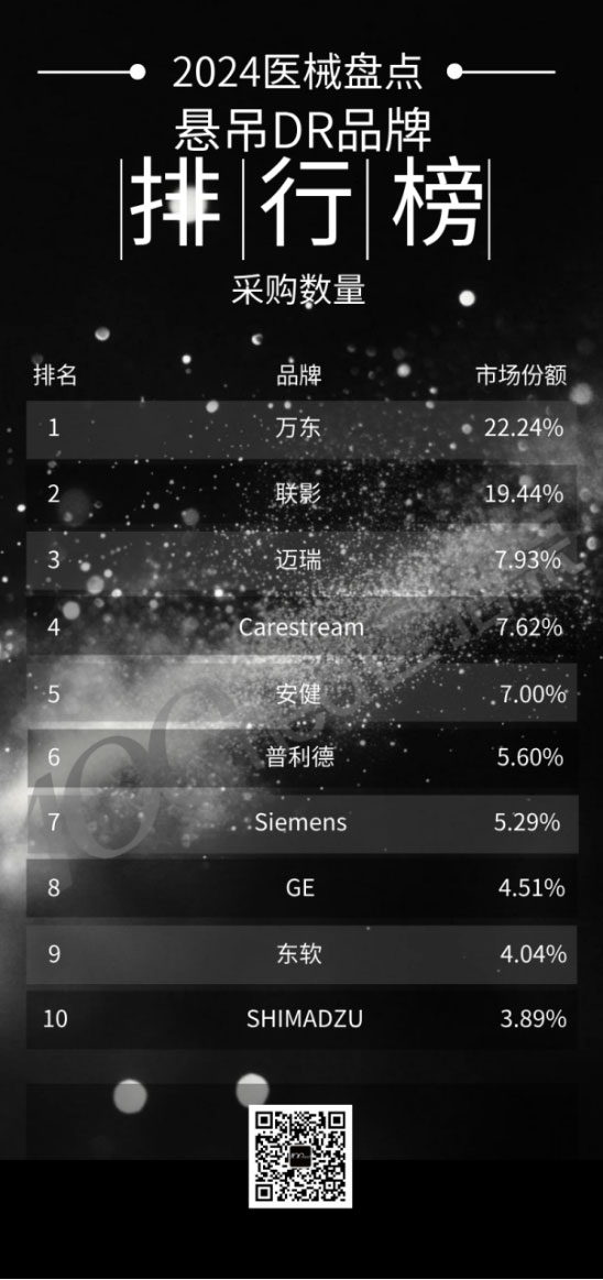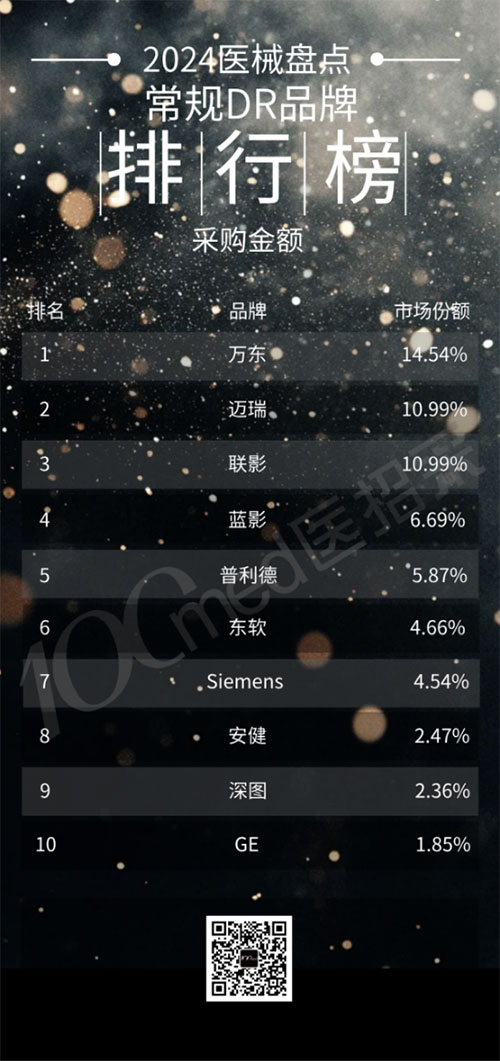 近日,2024年DR设备公开招标采购榜单揭晓,国产医疗设备拿下12个榜单中的10个第一,标志着国产替代向创新应用转型。万东医疗市占率第一,连续十余年霸榜,无愧DR王者称号。